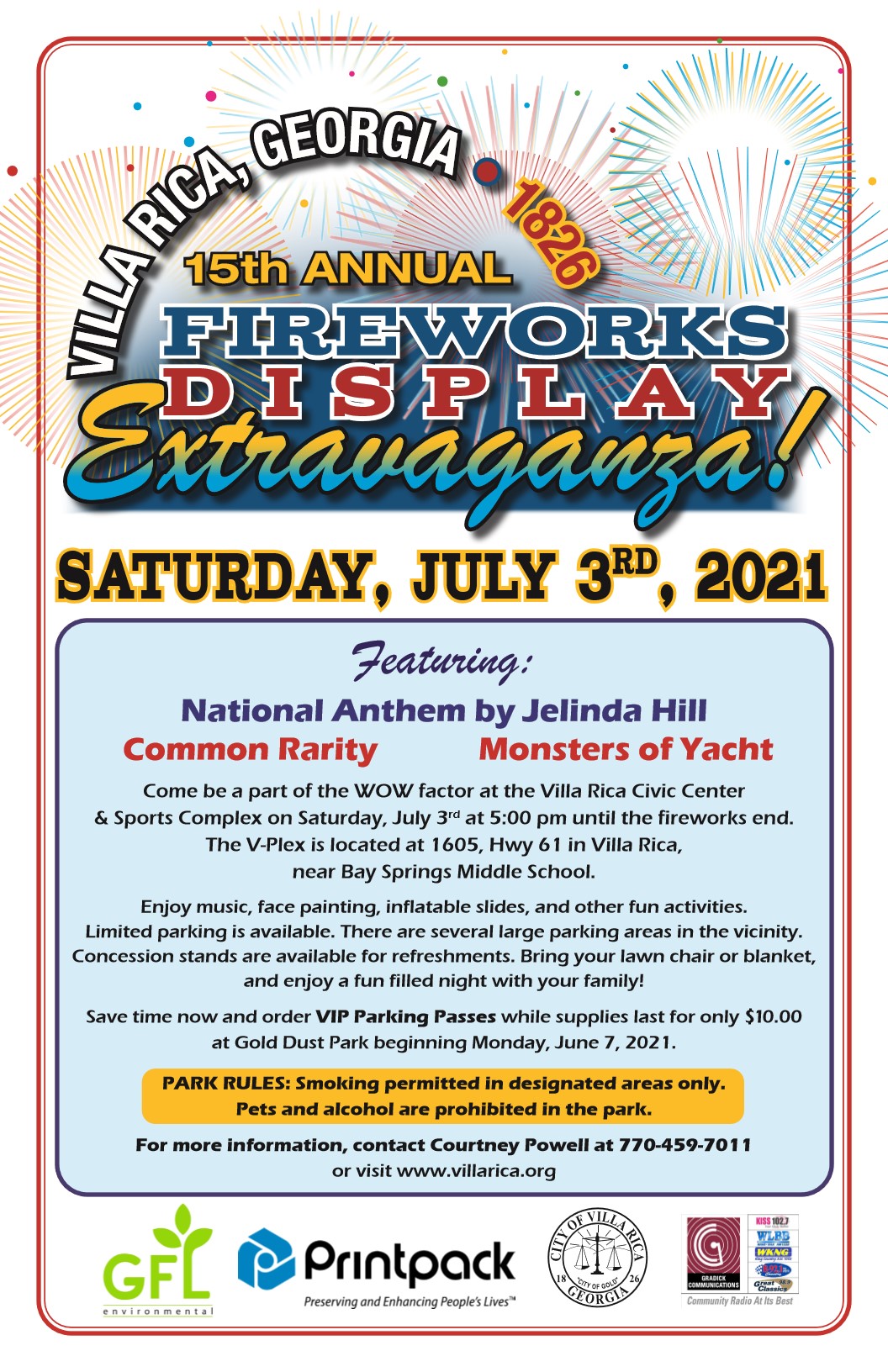 The City of Villa Rica’s Special Events, the Parks, Recreation, and Leisure Services Department will host our 15th Annual Fireworks Display Extravaganza on Saturday, July 3, 2021 at the Villa Rica Civic Center & Sports Complex (V-Plex). The fireworks display is free and the presentation will be conducted by East Coast Pyrotechnics which produces hundreds of fireworks shows annually. The fireworks show begins approximately 9:30 p.m. This year’s event will kick-off at 5:00 p.m. and include a national anthem performance by Jelinda Hill, a natural-born singer and photographer from Villa Rica.
